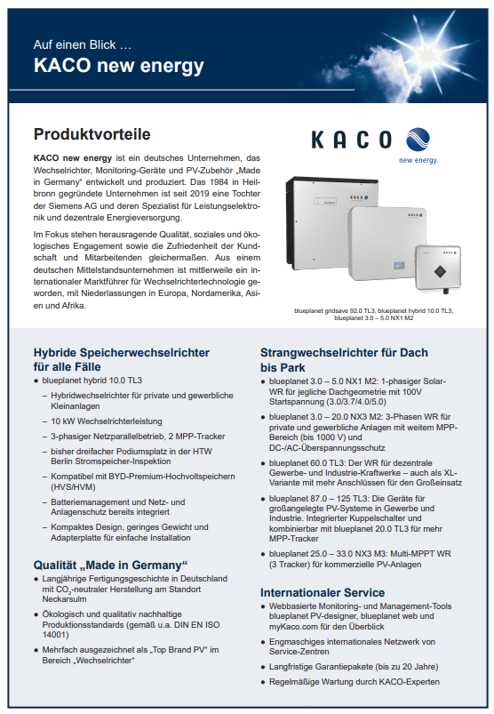 KACO new energy ist ein führender Hersteller von Wechselrichtern und Energiespeichersystemen für Photovoltaikanlagen. Denn seit über 20 Jahren entwickelt das Unternehmen innovative Lösungen für den Solarmarkt.